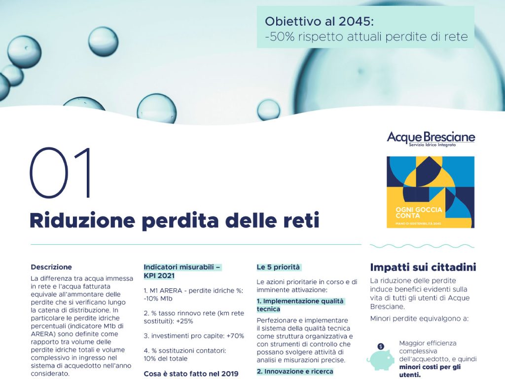 Quality, passion for the territory, innovation: these are the tracers of Acque Bresciane’s 2045 Sustainability Plan. An ambitious and future-oriented project that confirms the commitment of the Brescia utility, identifies long-term guidelines in the quality field and defines the 9 strategic sustainability objectives. Amapola supported Acque Bresciane in all phases of the journey, handling the initial involvement phase of corporate top management through facilitated meeting moments to ratify the drafting of the 9 Objectives storytelling, editing and part of the content copy, as well as the graphic design of the document, available in digital version here. Signs, images and visual contributions accompany the textual storytelling and the presentation of the journey and 9 sustainability objectives of Acque Bresciane: loss reduction, drinking water quality, reuse and treatment water, emission reduction, user centrality, workplace safety, welfare improvement, economic and financial balance, sustainability promotion. To highlight, enhance and make the main contents of the 2045 sustainability plan more easily consultable, Amapola created 9 subjects posters dedicated to the related sustainability objectives and a summary infographic, also in video version, useful tools for spreading the project on internal channels and digital properties. “The 2045 sustainability plan establishes a further commitment by the company to strengthen the relationship of transparency, trust and dialogue with all our stakeholders and to share with them long-term goals and ambitions, in a common challenge towards sustainability tells Francesco Esposto, CSR Manager Acque Bresciane. Every drop counts is the title we chose to transmit the sense of great concreteness that Acque Bresciane’s action will have in the coming years and to testify to the company’s daily attention to everything concerning water and its management.” Acque Bresciane’s 2045 sustainability plan is available here: https://www.acquebresciane.it/sviluppo-sostenibilita/piano-sostenibilita