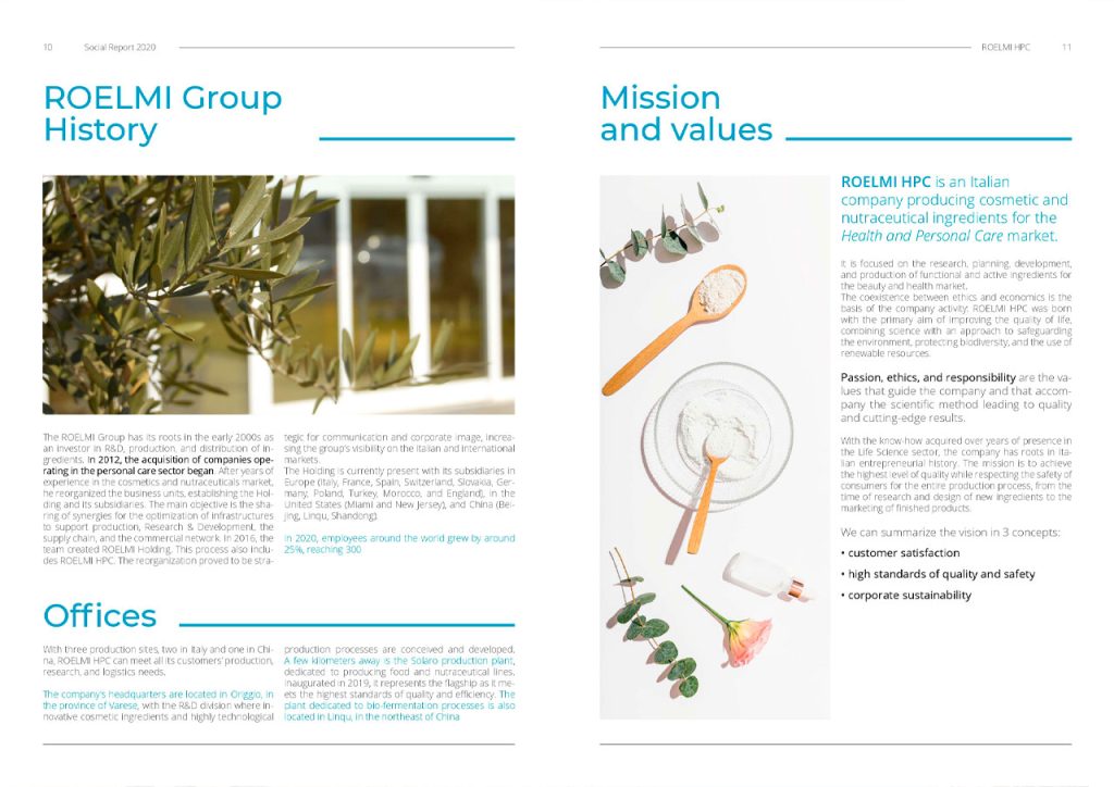 ROELMI HPC is an Italian company that produces cosmetic and nutraceutical ingredients for the international Health and Personal Care market. Always focused on combining research, innovation and responsibility, for 2020 it published a Social Report entitled “Innovation and sustainability”, for which it entrusted Amapola with the storytelling and the content editing.