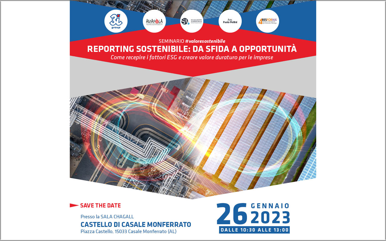 Sustainability reporting is one of today’s key challenges. To explore the question with businesses and organisations, Amapola is organising a seminar on Thursday 26 January 2023 (from 10.30 a.m. to 1 p.m.) in the Chagall Room in Casale Monferrato Castle, entitled Sustainable reporting, challenges and opportunities, together with 3i group, the Scagliotti Alberghina accountancy firm, Resforma SRL and Attorney Paolo Pollini. Register here.