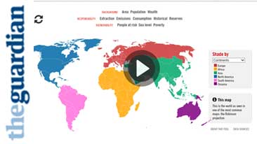 Ma l’area è solo una delle lenti attraverso le quali guardare il mondo. Questo sito offre altre lenti, ad esempio dove si trova la gente … e dove si trovano i soldi. Questo sito, però, riguarda principalmente il cambiamento climatico. Navigate le mappe “Responsibility” per vedere come ogni Paese incide in termini di emissioni CO2, dall’estrazione dei carburanti fossili … il loro utilizzo … fino al consumo dei beni e dei servizi che ne risultano. E’ anche possibile vedere le emissioni storiche, cui la maggior parte si trova ancora nell’atmosfera, e le emissioni potenziali attualmente racchiuse nelle riserve di carbone, petrolio e gas.