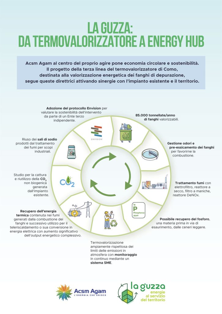 Acsm Agam è una delle principali multiutility del nord Italia, frutto dell’aggregazione fra le utility di Como, Monza, Lecco, Sondrio, Varese. Tra gli obiettivi e i progetti del nuovo Piano Industriale, è prevista la costruzione della terza linea del termovalorizzatore di Como dedicata esclusivamente al trattamento dei fanghi di depurazione. Il progetto, nella sua fase preliminare, è stato presentato alla cittadinanza e agli stakeholder del territorio attraverso lo strumento del confronto pubblico. Il percorso si è snodato in quattro incontri di presentazione e approfondimento sulle caratteristiche del progetto e in una giornata di visita dell’impianto di termovalorizzazione di Como dedicata ai cittadini.
