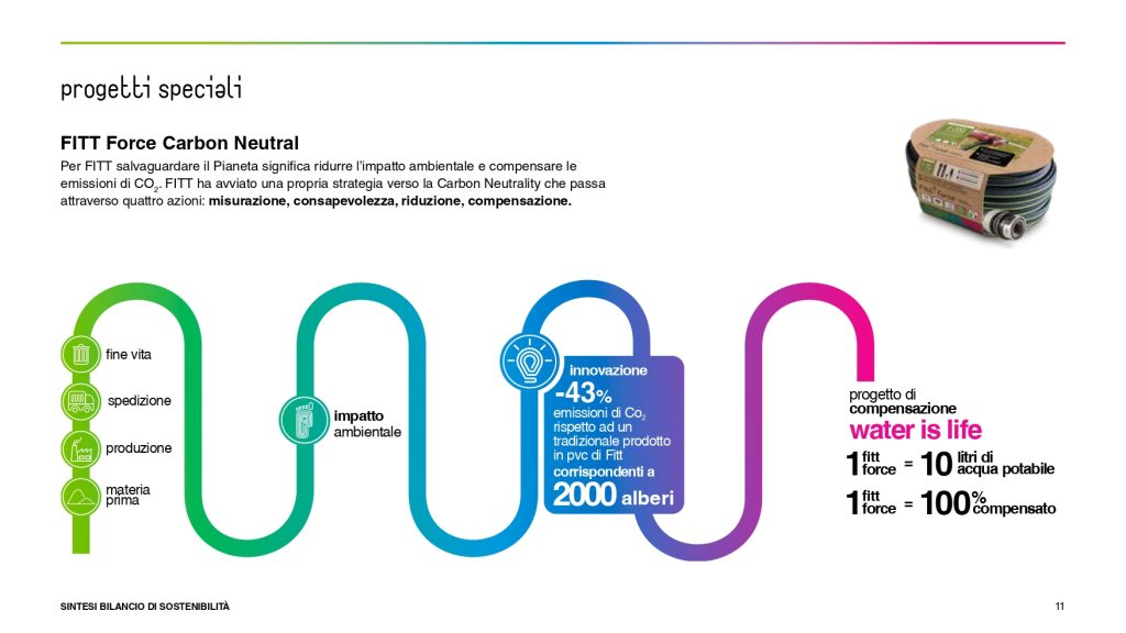 FITT SPA è un’azienda italiana leader internazionale nella produzione di tubazioni in materiale termoplastico per passaggi di fluidi. L’azienda è gestita dalla famiglia Mezzalira che da oltre 50 anni porta avanti una produzione di alta qualità, con attenzione all’ambiente e alla tutela delle risorse del Pianeta. La sostenibilità è parte del DNA dell’azienda, che dal 2020 rendiconta anche le proprie iniziative, i progetti e gli obiettivi di CSR nel Bilancio di sostenibilità.