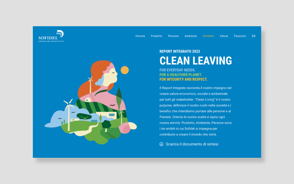 Clean Living, questo il titolo del Report Integrato 2022 di Sofidel, leader mondiale nella produzione di carta per uso igienico e domestico, che da subito ha voluto mettere in chiaro il purpose della propria organizzazione: attenzione alle necessità quotidiane delle persone, impegno per un pianeta più in salute e una cultura d’impresa che si fonda su integrità e rispetto. Amapola ha affiancato l’azienda nella valorizzazione del Report Integrato 2022, attraverso un progetto che integra strumenti e soluzioni di comunicazione accessibili, dinamici e multimediali.